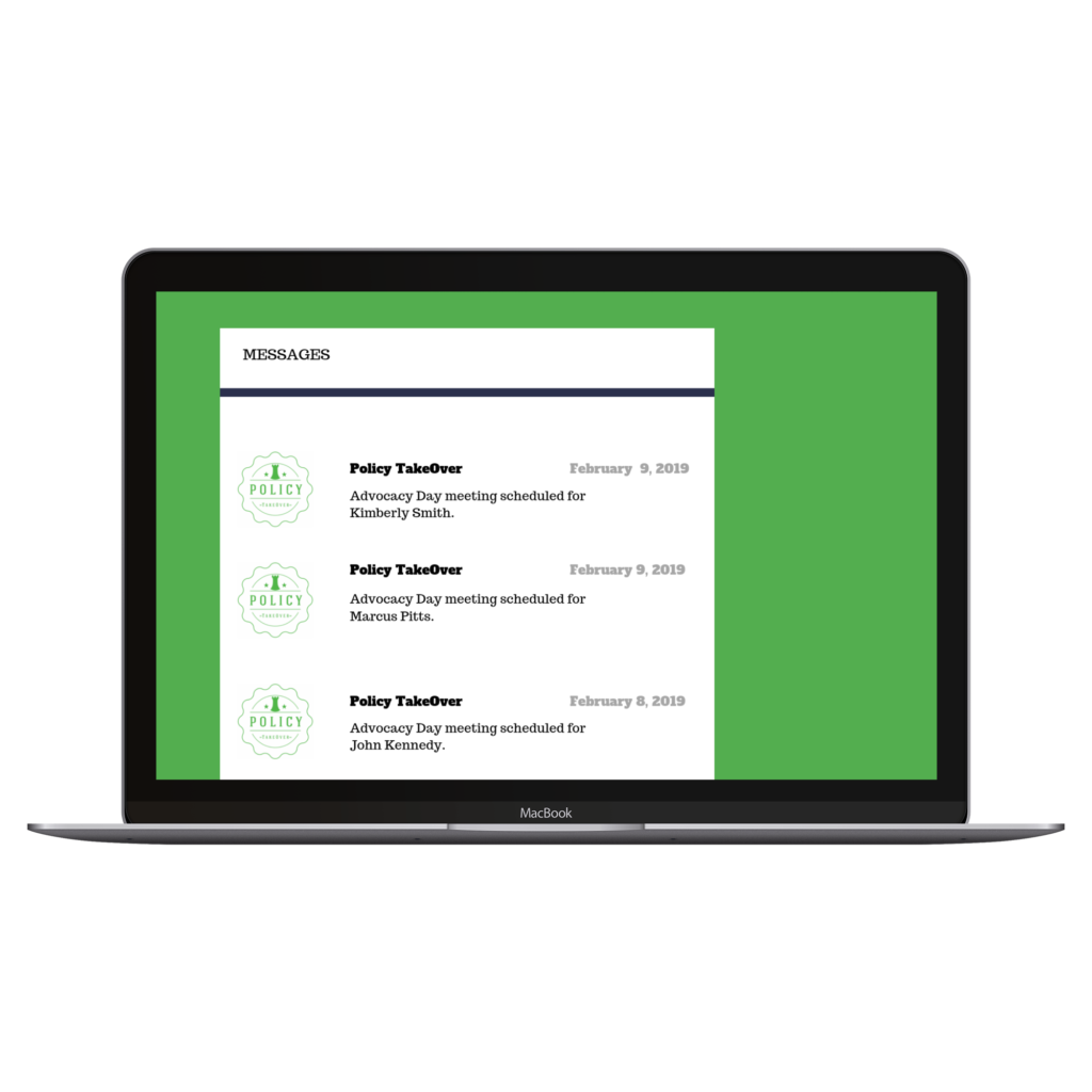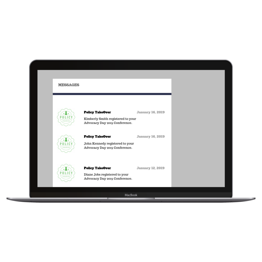 Policy TakeOver sends all communication to the organizer of the Advocacy Day event. The organizer has the option to allow Policy TakeOver to send email communication to registrants of the Advocacy Day event as well.